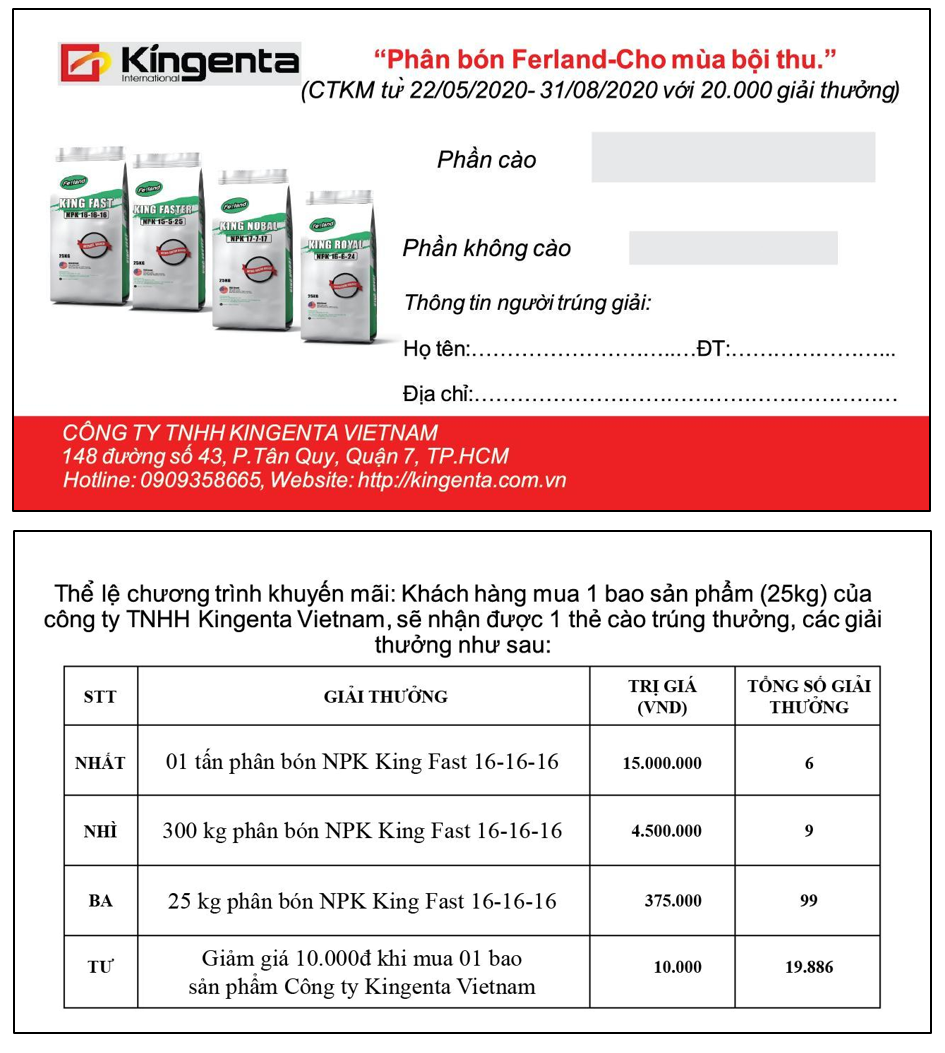 – Thẻ cào trúng thưởng được tặng ngay khi khách hàng mua sản phẩm của công ty TNHH Kingenta Vietnam từ nhân viên đại lý của Công ty Kingenta Vietnam trong thời gian diễn ra khuyến mại.
